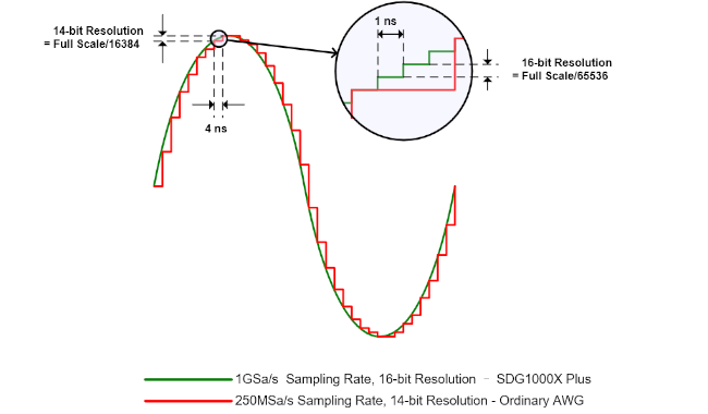 High resolution and sampling rates are critical for accurate signal simulation and analysis. The SDG1000X Plus series offers a high-performance sampling system with 16-bit vertical resolution and a 1 GSa/s sampling rate, delivering precise signal details and ensuring high fidelity. It is well-suited for applications requiring accurate signal generation, such as the development and testing of communication equipment.
