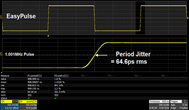 With traditional DDS technology, there will be a jitter of one sampling period when sampling rate and output frequency are not integer multiple. With EasyPulse technology, this can be solved perfectly. In addition to output low jitter Square and Pulse signals, EasyPulse tech has advantages of: