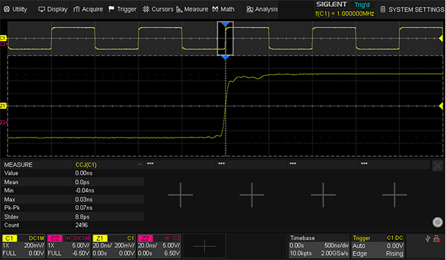 The SDG3000X EasyPulse technologies is optimized for pulse signal generation. It is capable of producing pulses as narrow as 8 ns with fast rising/falling edges that remain stable across frequency variations. It allows for wide-ranging, fine-grained adjustments of edge timing and pulse width, making it ideal tool for generating high-precision pulse signals.