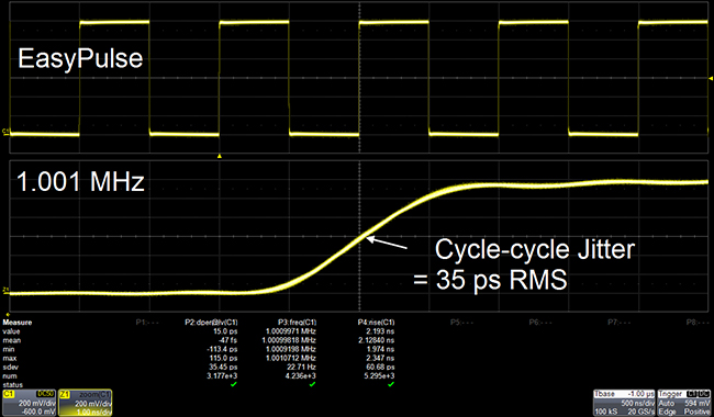 With traditional DDS technology, there will be a jitter of one sampling period when sampling rate and output frequency are not integer multiple. With EasyPulse technology, this can be solved perfectly. In addition to output low jitter Square and Pulse signals, EasyPulse tech has advantages of: