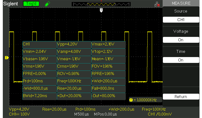 Support display 32 kinds of automatically measurements on screen or 5 kinds of measurements below the waveforms.