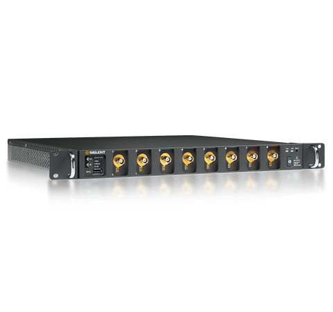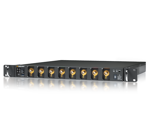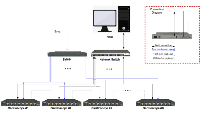 The SDS5000L features a compact form factor with a mere 1U height, enabling the construction of flexible multi-channel acquisition systems. Multiple units are combined to create a high-speed acquisition system with up to 512 channels by being triggered with low-skew synchronization signals from the 64-channel synchronization distributor SYN64 The host can access each unit over 1000M LAN. A complete SCPI command set as well as LabVIEW and IVI drivers are provided for easy data acquisition. The LAN port is LXI compliant. Sample clocks are synchronized between all units in the test system by cascading the 10 MHz In and 10 MHz Out clocks in a daisy chain.