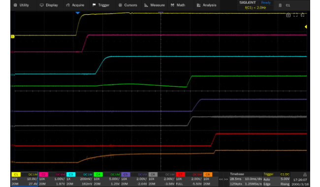 Modern electronic systems incorporate various chips and modules whose initialization and operation may interfere with each other. Power-up sequence testing ensures that signals from different circuit modules follow the correct timing to avoid conflicts and guarantee system stability. For example, improper power-up sequences in communication systems can lead to data transmission errors. As circuit complexity increases, so do the challenges of power-up testing. The SDS5000L captures the entire power-up process of all relevant signals in a single acquisition, reducing measurement time, improving efficiency, and minimizing errors caused by repeated tests. For complex circuits with 8 power rails, this capability enables one-shot measurements.