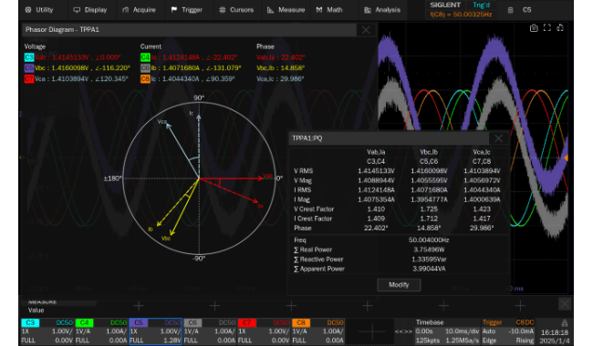 Using an 8-channel oscilloscope for three-phase power analysis allows simultaneous connection to all phases. It synchronously measures three-phase voltage and current signals, accurately capturing waveforms and parameters in real time. Users can directly observe and compare phase relationships to ensure balance. With the Fast Fourier Transform (FFT) function, multi-channel oscilloscopes perform harmonic analysis on three-phase signals. Optional three-phase analysis software supports vector diagram testing for motors, power quality assessment, ripple analysis, and efficiency evaluation.