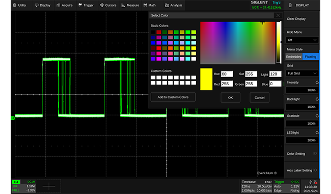 It is also easily customized, you can choose your favorite channel traces colors, default settings, menu styles, measurement formats and so on. The faster UI response of SDS6000A makes R&D work even more pleasing.