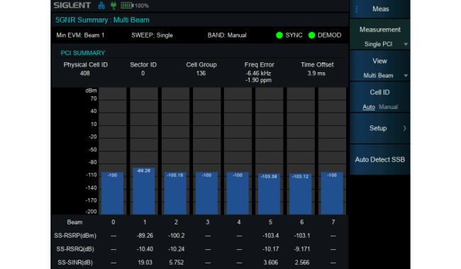 During 5G base station deployment, operators require precise validation of network quality and beam performance. The SHA860A’s 5G NR OTA mode demodulates signals to extract key parameters, including frequency, physical cell identity (PCI), SSB index, frequency error, and error vector magnitude (EVM) for the SSB portion, visualized via constellation diagrams. This functionality is vital for optimizing 5G Non-Standalone (NSA) deployments, ensuring seamless coordination between LTE and 5G networks.