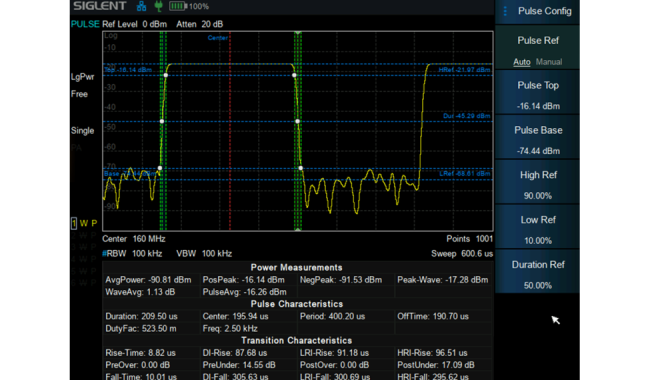 The pulse analysis function featuring 10,001 measurement points to evaluate power, pulse transitions, and signal characteristics using multiple detection modes (positive/negative peak, sample, average, and conventional). This ensures rigorous validation of RF device performance in real-world conditions.