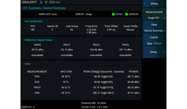 The LTE OTA testing feature provides comprehensive demodulation metrics such as PCI, sector ID, cell group, frequency error, time offset, synchronization status, and power levels (PSS/SSS/CRS/PBCH), alongside EVM measurements and constellation diagrams. By analyzing signal quality, channel performance, and interference across multiple cells, technicians can implement targeted strategies to enhance network efficiency and user experience.