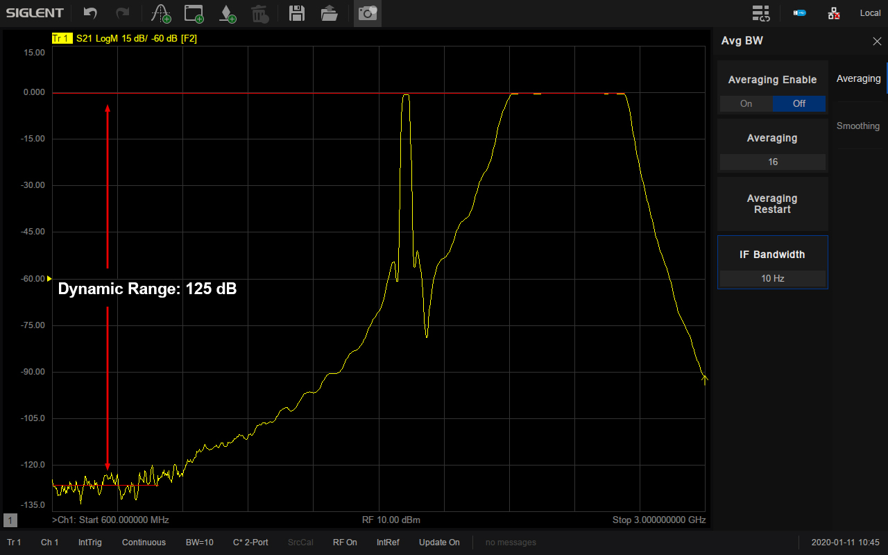 System Dynamic range, the difference between the measurement power available at the test port and the noise floor of the receiver is critical parameter of a VNA. The SIGLENT SNA5000A dynamic range is up to 125 dB@10 Hz IFBW, noise floor is down to -125 dBm/Hz, satisfies specific RF test requirements like test passband and out-of-band rejection of filters simultaneously.
