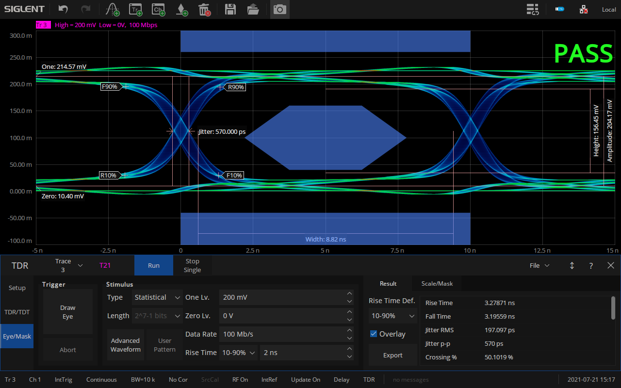 Without the need of an external generator, it can generate eye diagram with internal virtual pattern generator. Eye/Mask is a genuine signal integration analysis tool.