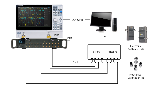 SSM single unit can expand the output ports to 24 and can be easily integrated, greatly adapt to the automatic test system and production line scenarios. The multi-port measurement capability of VNA can improve test throughput and thereby significantly reduce device test costs. Typical applications include design, verification and production of antenna, data converter interfaces, automatic test of RF components and other devices, etc.