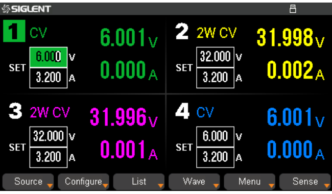 | Channel output | SPD4323X:6V/3.2A, 32V/3.2A, 32V/3.2A, 6V/3.2A SPD4121X: 15V/1.5A, 12V/10A, 12V/10A, 15V/1.5A SPD4306X: 15V/1.5A, 30V/6A, 30V/6A, 15V/1A |