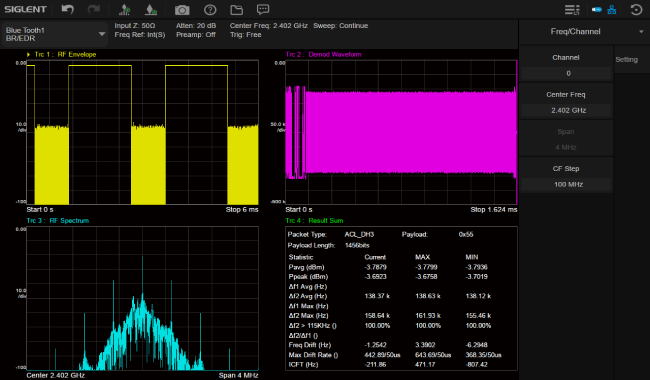 The measurement application follows the Bluetooth® RF test specification issued by Bluetooth SIG to calculate the measurement results, and automatically detects the protocol version of the signal for Bluetooth BR/EDR/LE with one-click measurements to help you design, evaluate and manufacture Bluetooth devices with confidence. Together with the new SigIQPro signal generation software and a SSG5000X-V generator, it forms an economical and efficient SIGLENT Bluetooth signal generation and signal analysis solution, accelerating the process from signal generation to data to evaluation.