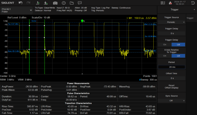 Siglent's SSA5000A Pulse Measurement option can help engineers better analyze today's dynamic signal environments with automatic power level, pulse characteristic, and conversion characteristic measurements. With high resolution bandwidth up to 10MHz the rise time measurement result can be as low as 66ns, making accurate measurements on a wide range of pulse types with a variety of triggering methods to cleanly capture the pulse shape.