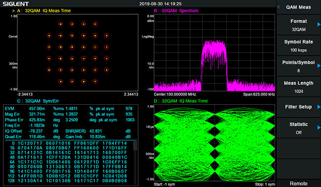 - EVM, amplitude and phase offset error, IQ offset error, gain imbalance and many other data analysis capabilities