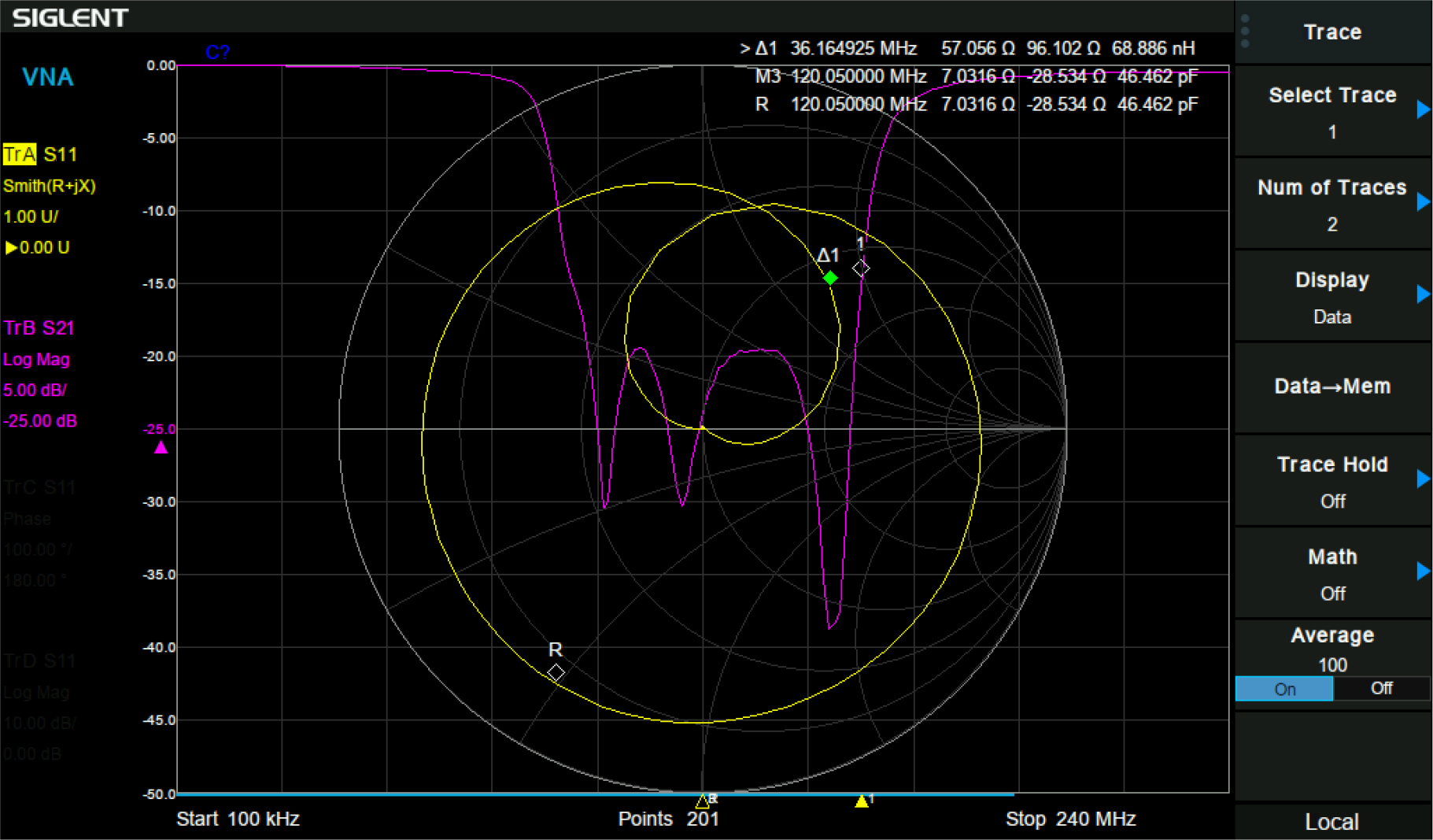 - Display reflection/transmission coefficient, return/insertion loss, phase, group delay, standing wave ratio, Smith chart, polar circle chart, etc.